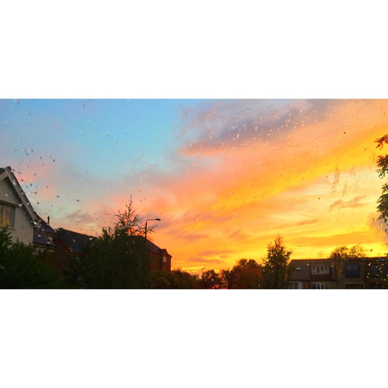 The sky caught my eye last night, whilst I was on my travels. It was blue but the clouds had a warm pinkish tone to it. Also, it displayed a streak of orange. So, I decided to capture the moment, before the sun went down. It was also raining as well, as I thought that would add to the effect too.